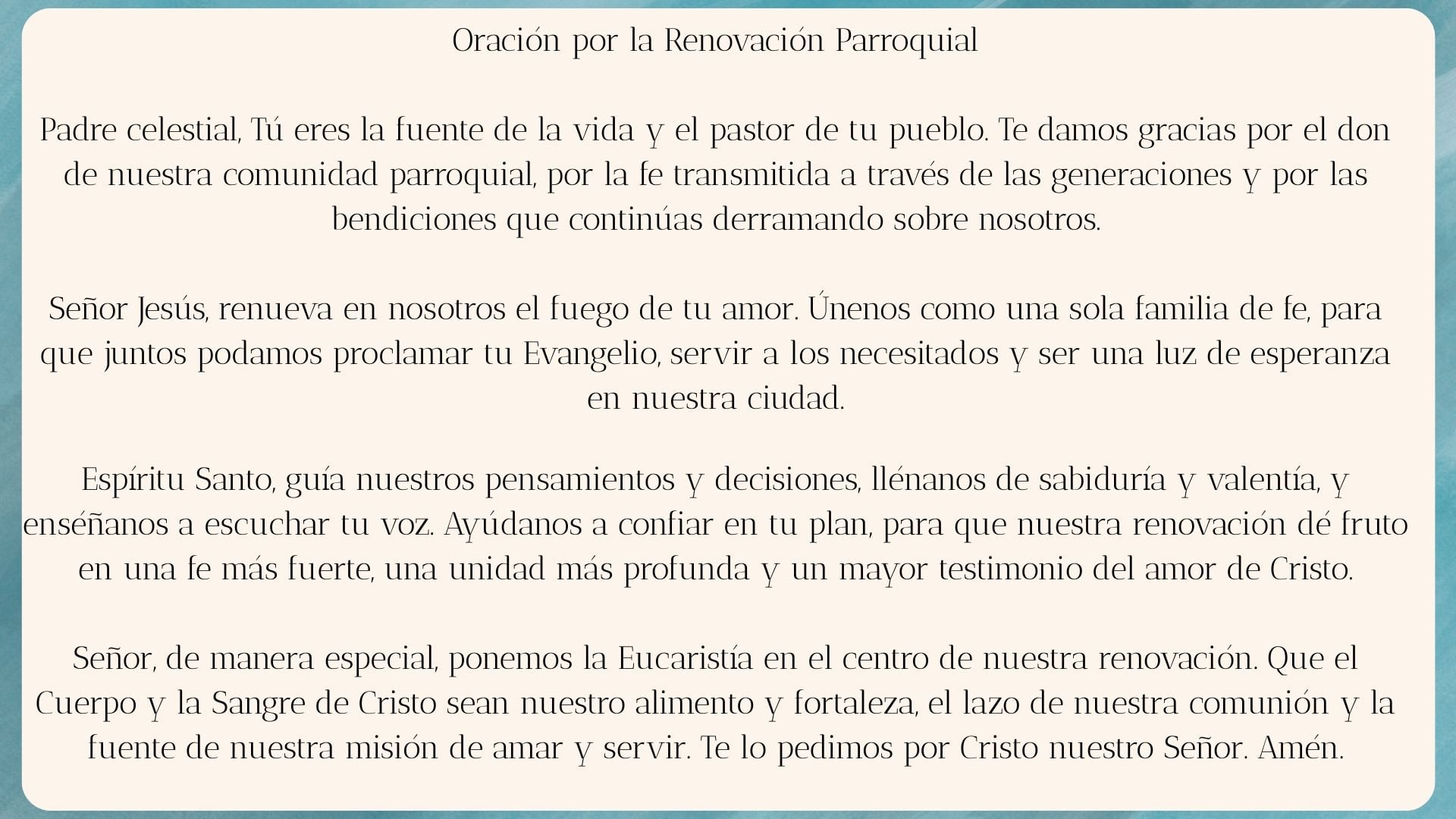 En el corazón de nuestra renovación parroquial está la oración. La renovación no se trata simplemente de reorganizar estructuras o ajustar recursos; es, ante todo, abrirnos a la guía del Espíritu Santo. Solo a través de la oración podemos discernir hacia dónde nos conduce Dios, y solo en la oración encontramos la fuerza y el valor para seguirlo.